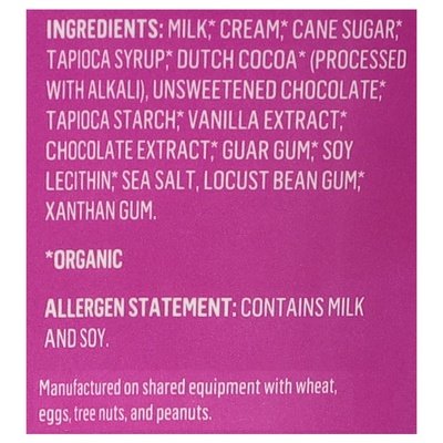 INGREDIENTS: Milk (Organic), Cream (Organic), Cane Sugar (Organic), Tapioca Syrup (Organic), Dutch Cocoa (Organic) (Processed with Alkali), Unsweetened Chocolate (Organic), Tapioca Starch (Organic), Vanilla Extract (Organic), Chocolate Extract (Organic), Guar Gum (Organic), Soy Lecithin (Organic), Sea Salt, Locust Bean Gum (Organic), Xanthan Gum.