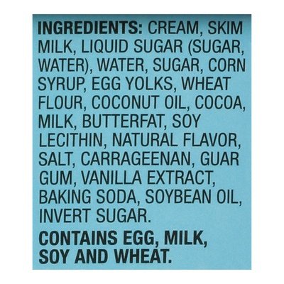 INGREDIENTS: Cream, Skim Milk, Liquid Sugar (Sugar, Water), Sugar, Corn Syrup, Egg Yolks, Wheat Flour, Coconut Oil, Cocoa, Milk, Butterfat, Soy Lecithin, Natural Flavor, Salt, Carrageenan, Guar Gum, Vanilla Extract, Baking Soda, Soybean Oil, Invert Sugar.