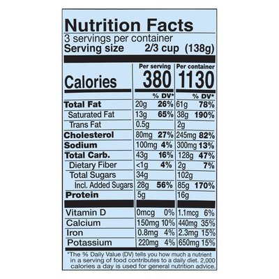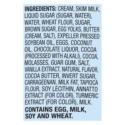 INGREDIENTS: Cream, Skim Milk, Liquid Sugar (Sugar, Water), Water, Wheat Flour, Sugar, Brown Sugar, Egg Yolks, Butter (Cream, Salt), Expeller Pressed Soybean Oil, Eggs, Coconut Oil, Chocolate Liquor, Cocoa (Processed with Alkali), Cocoa Molasses Guar Gum, Salt, Vanilla Extract, Natural Flavor, Cocoa Butter, Invert Sugar, Carrageenan, Milk Fat, Tapioca Flour, Soy Lecithin, Annatto Extract (for Color), Turmeric Extract (for Color), Milk.