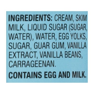INGREDIENTS: Cream, Skim Milk, Liquid Sugar (Sugar, Water), Water, Egg Yolks, Sugar, Guar Gum, Vanilla Extract, Vanilla Beans, Carrageenan.