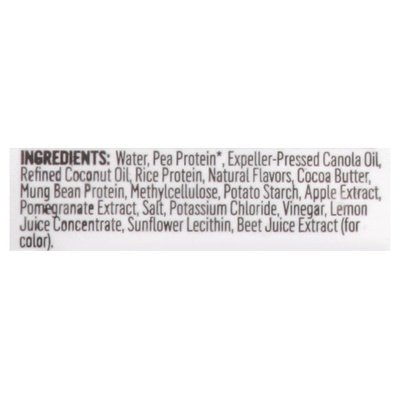 INGREDIENTS: Water Pea Protein (Peas Are Legumes, People with Severe Allergies to Legumes Like Peanuts Should Be Cautious When Introducing Pea Protein Into Their Diet Because of the Possibility of a Pea Allergy), Avocado Oil, Natural Flavors, Rice Protein, Lentil Protein, 2% or Less Methylcellulose, Potato Starch, Pea Starch, Potassium Lactate, (to Preserve Freshness), Faba Bean Protein, Apple Extract, Pomegranate Concentrate, Potassium Salt, Spice, Vinegar, Vegetable Juice Color (with Beef).