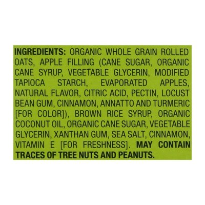 INGREDIENTS: Oat Crust (Organic Whole Grain Rolled Oats, Brown Rice Syrup, Organic Coconut Oil, Organic Cane Sugar, Vegetable Glycerin, Xanthan Gum, Sea Salt, Organic Cinnamon, Vitamin E ([for Freshness]), Apple Filling (Cane Sugar, Organic Cane Syrup, Vegetable Glycerin, Modified Tapioca Starch, Evaporated Apples, Natural Flavor, Citric Acid, Pectin, Locust Bean Gum, Cinnamon, Annatto and Turmeric [for Color]).