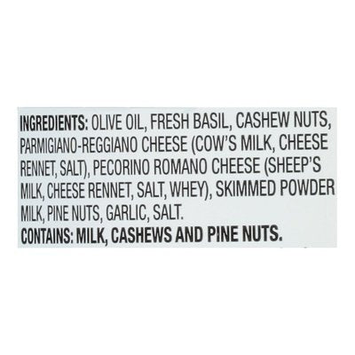 INGREDIENTS: Olive Oil, Fresh Basil, Cashew Nuts, Cheese (Cow's Milk, Cheese Parmigiano-Reggiano Rennet, Salt), Pecorino Romano Cheese (Sheep's Milk, Cheese Rennet, Salt, Whey), Skimmed Powder Milk, Pine Nuts, Garlic, Salt.