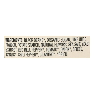INGREDIENTS: Black Beans (Dried), Organic Sugar, Lime Juice Powder, Potato Starch, Natural Flavors Sea Salt, Yeast Extract, Red Bell Pepper (Dried), Tomato (Dried), Onion (Dried), Spices, Garlic (Dried), Chili Pepper (Dried), Cilantro (Dried).