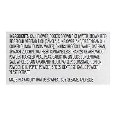 INGREDIENTS: Cauliflower, Cooked Brown Rice (Water, Brown Rice), Rice Flour, Expeller Pressed Canola Oil and/or Sunflower Oil, Cooked Quinoa (Quinoa, Water), Onions, Broccoli, Water, Oat Bran, Spinach, Zucchini, Oat Fiber, Contains Less than 2% of Arrowroot Powder, Flaxseed Meal, Peas, Garlic, Raisin Juice Concentrate, Salt, Whole Grain Amaranth Flour, Parsley, Cornstarch, Onion Powder, Chili Pepper Powder, Spices, Dextrose, Garlic Powder, Yeast Extract.