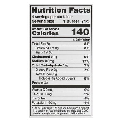 PRODUCT DETAILS: A golden-crusted, great-tasting burger packed with the goodness of cauliflower and 5 other veggies. 150 calories per serving. Certified vegan. Vegan.org. Certified gluten free. gfco.org. Gluten free. Soy free. Non-GMO Project verified. nongmoproject.org. New! Great in the air fryer! Dr Praeger's: Where tasty meets veggie, flavor meets goodness, & easy meets mealtime wins! We turn veggies into utterly delicious food, so you never have to choose between crave-able and veggie-forward. Inspired by our heart surgeon founders, dr. Praeger's has been a trusted source for satisfying, plant-based meals for 30 years and counting. Crunchy Cauliflower Veggie Burgers: A golden-crusted, great-tasting burger packed with the goodness of cauliflower and 5 other veggies. drpraegers.com. Paperboard packaging. Recyclable.