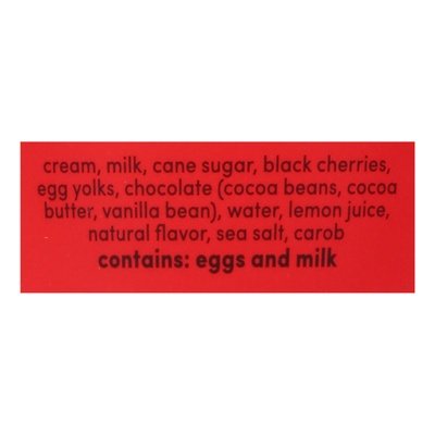 INGREDIENTS: Cream, Milk, Cane Sugar, Black Cherries, Egg Yolks, Chocolate (Cocoa Beans, Cocoa Butter, Vanilla Bean), Water, Lemon Juice, Natural Flavor, Sea Salt, Carob.