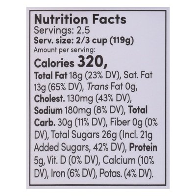 INGREDIENTS: Cream, Milk, Cane Sugar, Egg Yolks, Wheat Flour, Coconut Oil, Cocoa Powder, Sunflower Oil, Vanilla Extract (Grain Alcohol, Vanilla Bean), Baking Soda, Sunflower Lecithin, Salt.