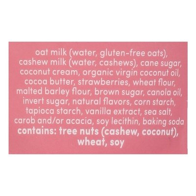 INGREDIENTS: Oat Milk (Water, Gluten - Free Oats), Cashew Milk (Water, Cashews), Cane Sugar, Coconut Cream, Organic Virgin Coconut Oil, Cocoa Butter, Strawberries, Wheat Flour, Malted Barley Flour, Brown Sugar, Canola Oil, Invert Sugar, Natural Flavors, Corn Starch, Tapioca Starch, Vanilla Extract, Sea Salt, Carob and/or Acacia, Soy Lecithin, Baking Soda.
