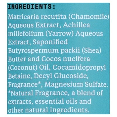 INGREDIENTS: Matricaria Recutita (Chamomile) Aqueous Extract, Achillea Millefolium (Yarrow) Aqueous Extract, Saponified Butyrospermum Parkii (Shea) Butter and Cocos Nucifera (Coconut) Oil, Cocamidopropyl Betaine, Decyl Glucoside, Fragrance (Natural Fragrance, a Blend of Extracts, Essential Oils and Other Natural Ingredients), Magnesium Sulfate.