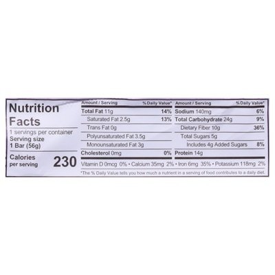 INGREDIENTS: Protein Blend (Organic) (Brown Rice Protein (Organic), Pumpkin Seed Protein (Organic)), Tapioca Fiber (Organic), Sunflower Seed Butter (Organic) (Roasted Sunflower Seeds (Organic), Sunflower Oil (Organic)), Dark Chocolate (Organic) (Chocolate (Organic), Cane Sugar (Organic), Cocoa Butter (Organic)), Tapioca Syrup (Organic), Vegetable Glycerin (Organic), Pecans (Organic), Brown Rice Crisps (Organic) (Brown Rice (Organic), Brown Rice Syrup (Organic), Salt), Caramel (Organic), Natural Flavor (Organic), Sea Salt, Sunflower Lecithin (Organic).