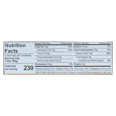 INGREDIENTS: Protein Blend (Organic) (Brown Rice Protein (Organic), Pumpkin Seed Protein (Organic)), Sunflower Butter (Organic) (Roasted Sunflower Seeds (Organic), Sunflower Oil (Organic)), Tapioca Fiber (Organic), Tapioca Syrup (Organic), Vegetable Glycerin (Organic), Chocolate Chips (Organic) (Cane Sugar (Organic), Chocolate (Organic), Cocoa Butter (Organic), Vanilla Powder (Organic)), Cocoa Powder (Organic), Cocoa Nibs(Organic), Brown Sugar (Organic), Ground Coffee (Organic), Coffee Extract (Organic), Natural Flavor (Organic), Sea Salt, Monk Fruit (Organic), Caffeine (Organic).