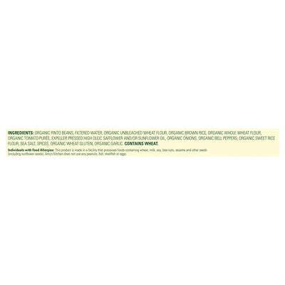 INGREDIENTS: Organic Pinto Beans, Filtered Water, Organic Unbleached Wheat Flour, Organic Brown Rice, Organic Whole Wheat Flour, Organic Tomato Puree, Expeller Pressed High Oleic Safflower and/or Sunflower Oil, Organic Onions, Organic Bell Peppers, Organic Sweet Rice Flour, Sea Salt Spices, Organic Wheat Gluten, Organic Garlic.