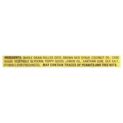 INGREDIENTS: Organic Whole Grain Rolled Oats, Brown Rice Syrup, Organic Coconut Oil, Organic Cane Sugar, Vegetable Glycerin, Poppy Seeds, Lemon Oil, Xanthan Gum, Sea Salt, Vitamin E (for Freshness).