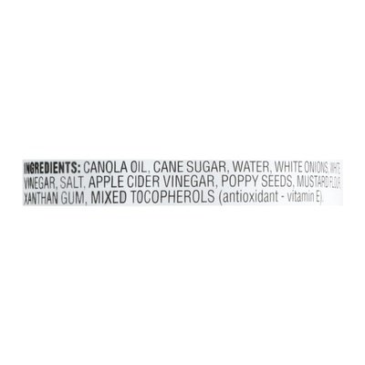 INGREDIENTS: Canola Oil, Cane Sugar, Water, White Onions, White Vinegar, Salt, Apple Cider Vinegar, Poppy Seeds, Mustard Flour, Xanthan Gum, Mixed Tocopherols (Antioxidant - Vitamin E).