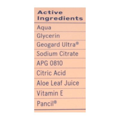 INGREDIENTS: Active Ingredients: Aqua; Function: Solvent; Content %: 96.46; Naturally Derived: 100; Synthetic %: 0; Active Ingredients: Glycerin; Function: Humectant; Content %: 1; Naturally Derived: 100; Synthetic %: 0; Active Ingredients: Geogard Ultra; Function: Preservative; Content %: 0.90; Naturally Derived: 75.25; Synthetic %: 24.75; Active Ingredients: Sodium Citrate; Function: Buffering/pH Control; Content %: 0.45; Naturally Derived: 0; Synthetic %: 100; Active Ingredients: APG 0810; Function: Cleansing; Content %: 0.10; Naturally Derived: 100; Synthetic %: 0; Active Ingredients: Citric Acid; Function: Preservative; Content %: 0.07; Naturally Derived: 0; Synthetic %: 100; Active Ingredients: Aloe Leaf Juice; Function: Conditioning; Content %: 0.01; Naturally Derived: 99.97; Synthetic %: 0.03; Active Ingredients: Vitamin E; Function: Nourishing; Content %: 0.01; Naturally Derived: 100; Synthetic %: 0; Active Ingredients: Pancil; Function: Deodorant; Content %: 1; Naturally Derived: 100 ; Synthetic %: 0.