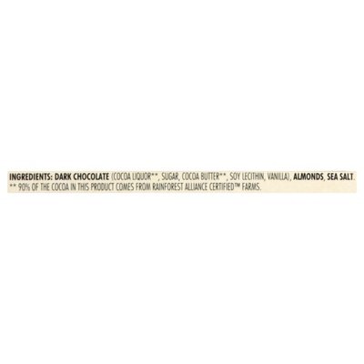 INGREDIENTS: Dark Chocolate (Cocoa Liquor (Rainforest Alliance Certified, Find Out More at Ra,Org), Sugar, Cocoa Butter (Rainforest Alliance Certified, Find Out More at Ra,Org), Soy Lecithin and/or Sunflower Lecithin, Vanilla), Almonds, Sea Salt.