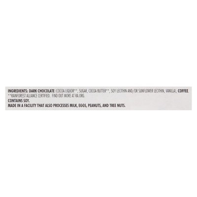 INGREDIENTS: Dark Chocolate (Cocoa Liquor (Rainforest Alliance Certified, Find Out More at Ra,Org), Sugar, Cocoa Butter (Rainforest Alliance Certified, Find Out More at Ra,Org), Soy Lecithin and/or Sunflower Lecithin, Vanilla), Coffee.