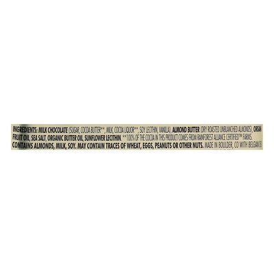 INGREDIENTS: Milk Chocolate (Sugar, Cocoa Butter (100% of the Cocoa in This Product Comes from Rainforest Alliance Certified Farms), Milk, Cocoa Liquor (100% of the Cocoa in This Product Comes from Rainforest Alliance Certified Farms), Soy Lecithin, Vanilla), Almond Butter (Dry Roasted Unblanched Almonds), Organic Fruit Oil, Sea Salt, Organic Butter Oil, Sunflower Lecithin.