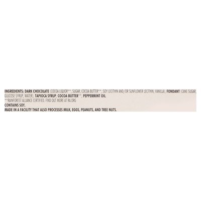 INGREDIENTS: Dark Chocolate (Cocoa Liquor (Rainforest Alliance Certified, Find Out More at ra.org), Sugar, Cocoa Butter (Rainforest Alliance Certified, Find Out More at ra.org), Soy Lecithin and/or Sunflower Lecithin, Vanilla), Fondant (Cane Sugar, Glucose Syrup, Water), Tapioca Syrup, Cocoa Butter (Rainforest Alliance Certified, Find Out More at ra.org), Peppermint Oil.