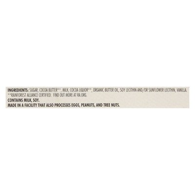 INGREDIENTS: Sugar, Cocoa Butter (Rainforest Alliance Certified Farms find more at ra.org), Milk, Cocoa Liquor (Rainforest Alliance Certified Farms find more at ra.org), Organic Butter Oil, Soy Lecithin and/or Sunflower Lecithin, Vanilla.