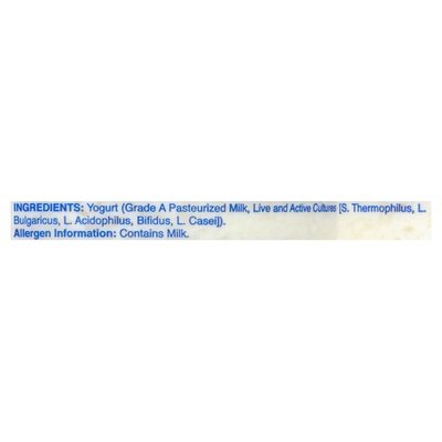 INGREDIENTS: Yogurt (Grade A Pasteurized Milk, Live and Active Cultures [S. Thermophilus, L. Bulgaricus, L Acidophilus, Bifidus, L. Casei]).