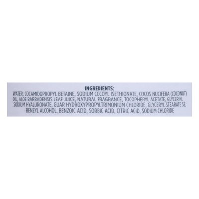 INGREDIENTS: Water, Cocamidopropyl Betaine, Sodium Cocoyl Isethionate, Cocos Nucifera (Coconut) Oil, Aloe Barbadensis Leaf Juice, Natural Fragrance, Tocopheryl Acetate, Glycerin, Sodium Hyaluronate, Guar Hydroxypropyltrimonium Chloride, Glyceryl Stearate SE, Benzyl Alcohol, Benzoic Acid, Sorbic Acid, Citric Acid, Sodium Chloride.