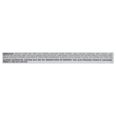 INGREDIENTS: Protein Blend [Soy Crisp (Soy Protein, Alkalized Cocoa, Tapioca, Salt), Calcium Caseinate, Whey Protein, Soy Protein, Rice Protein], Dark Chocolate (Unsweetened Chocolate, Cane Sugar, Cocoa Butter, Soy Lecithin, Vanilla), Vegetable Fiber (Inulin), Vegetable Glycerin, Sunflower Oil, Freeze Dried Raspberries, Alkalized Cocoa, Natural Flavors, Soy Lecithin, Salt, Citric Acid.