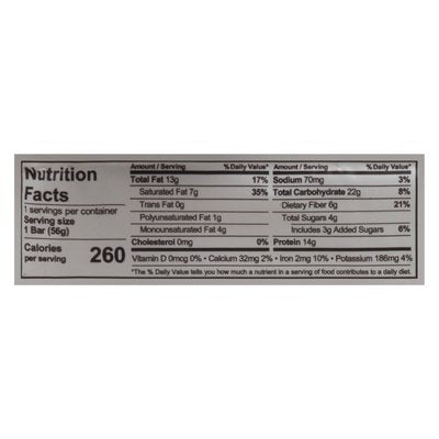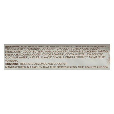 INGREDIENTS: Protein Blend (Organic) (Brown Rice Protein (Organic), Pumpkin Seed Protein (Organic)), Tapioca Syrup (Organic), Almonds (Organic), Coconut (Organic), Chocolate Chips (Organic) (Cane Sugar (Organic), Chocolate (Organic), Cocoa Butter (Organic), Vanilla Powder (Organic)), Vegetable Glycerin (Organic), Tapioca Fiber (Organic), Chocolate Liquor (Organic), Cocoa Powder (Organic), Cocoa Butter (Organic), Evaporated Coconut Water (Organic), Natural Flavor (Organic), Sea Salt, Vanilla Extract (Organic), Monk Fruit (Organic).