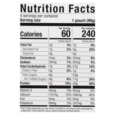 PRODUCT DETAILS: Yogurt pouch. 5 g protein per pouch. Lowfat. Certified gluten free. gfco.org. 2% milkfat 50% less sugar & 20% fever ingredients than leading kid's yogurt. This product : 6 g sugar, 8.5 ingredients. On average, 3.5 oz of fhe leading kid's yogurt: 12.3 g sugar, 10.8 ingredients. For on-the-go. Crafted with less: no high fructose corn syrup; no artificial sweeteners; no gelatin; no artificial colorings; no juice or concentrates; no preservatives. No rBST (no significant difference has been shown between milk derived from rBST treated and non-rBST treated cows). Grade A.