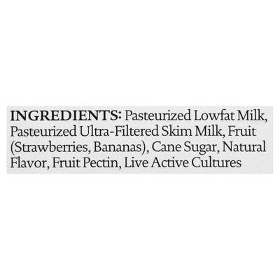 INGREDIENTS: Cultured Pasteurized Low Fat Milk, Milk Protein Concentrate, Fruit (Strawberry Puree, Bananas), Cane Sugar, Natural Flavor, Fruit Pectin, Live Active Cultures: S. Thermophilus, L. Bulgaricus.